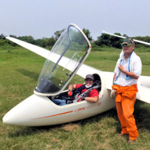 連日酷暑の続く中、今日も夏の高気圧にすっぽりと覆われ、朝から雲一つない快晴。参加者は僅か13名(内、岐阜支部から3名)、練習生3名と寂しい状況でしたが、今日はディスカスの耐空検査の日。朝早くから準備していた畑野整備士が、子安検査員の機体確認後、2回のフライトを無事終了し検査合格を頂きました。