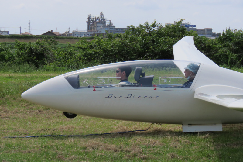曳航索の入れ替え作業があったので、飛び始めは11時過ぎとやや遅めのスタートになりましたが、サーマルもでき始めているようで、デュオ・ディスカスで中村教官と一緒に飛んだ私、不肖渡邊、離陸して程なく滞空開始。教官にサポートしてもらいつつ、ぐりんぐりんと回って岡崎空域の端から端までを飛び回って1時間17分の本日最長フライト。久しぶりにたっぷり飛べて、着陸直後は楽しさから笑みが漏れていました。