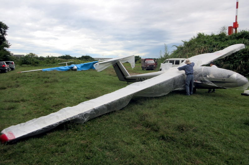 10月に入ってから、どうも天気の周期の巡りが良くないです。3週に渡って曇り空でのフライトになりまして、朝一に機体を組んだ頃に、ちょっとした前線の通過で雨。シートで養生しつつ、やり過ごします。